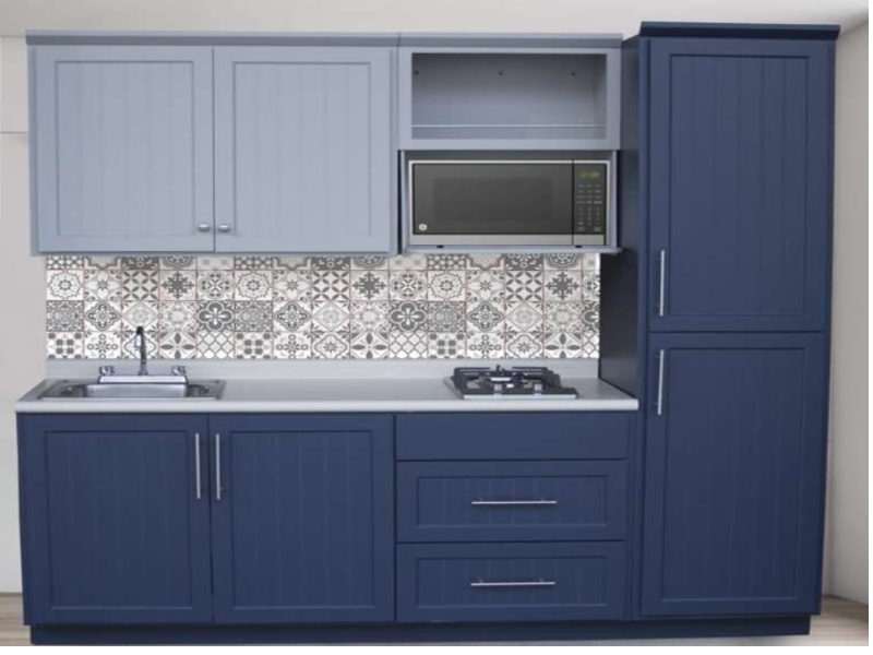 Diseño y Acabados Distintivos: La característica principal de este diseño es su impactante combinación de dos tonos de azul. Los gabinetes inferiores y la imponente torre de alacena (despensa) presentan un profundo acabado azul marino. Esto contrasta armónicamente con las alacenas superiores en un suave azul claro (azul grisáceo).