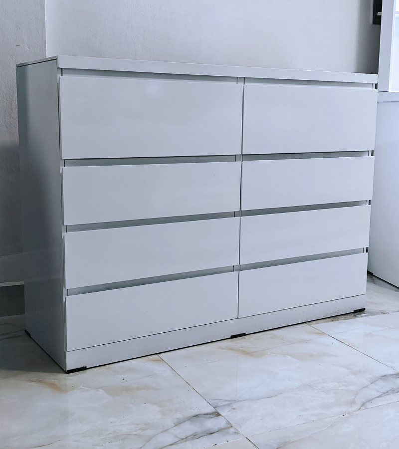 Diseño puro, organización inteligente. La Cómoda Minimalista “Cajones Ocultos” tiene 8 cajones con un diseño sin tiradores. Los 2 cajones superiores son joyeros con divisiones, y los 6 inferiores son profundos para ropa. Acabado en blanco brillante.