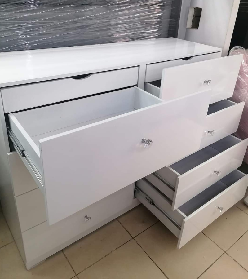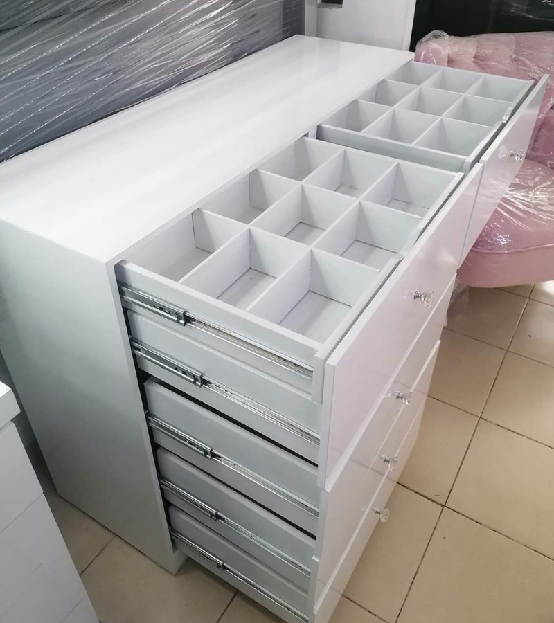- 8 cajones de almacenamiento (2 grandes, 6 pequeños) con herrajes de cristal.