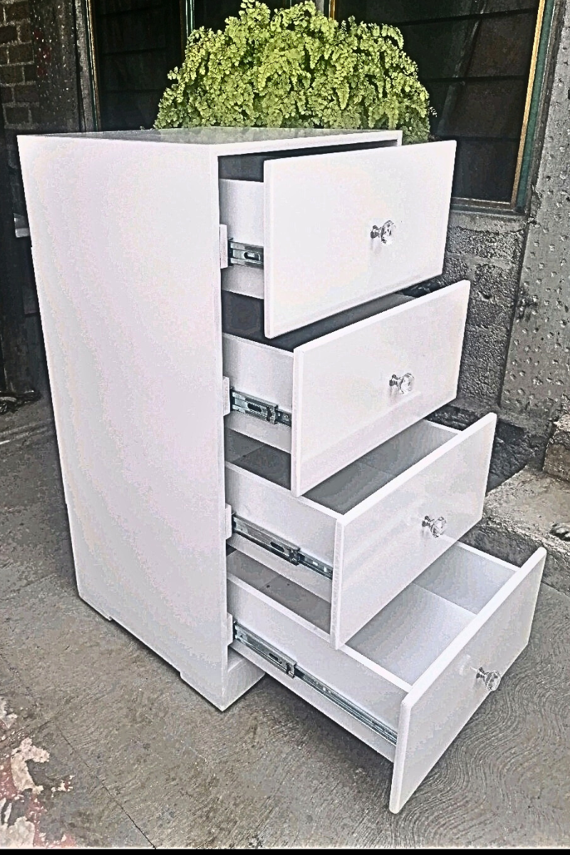 Almacenamiento Funcional El mueble cuenta con 4 espaciosos cajones, ideales para guardar ropa doblada, accesorios, maquillaje o artículos de tocador. Cada cajón está equipado con guías de extensión completa, lo que te permite abrirlos totalmente para un acceso fácil y cómodo a todo el contenido.