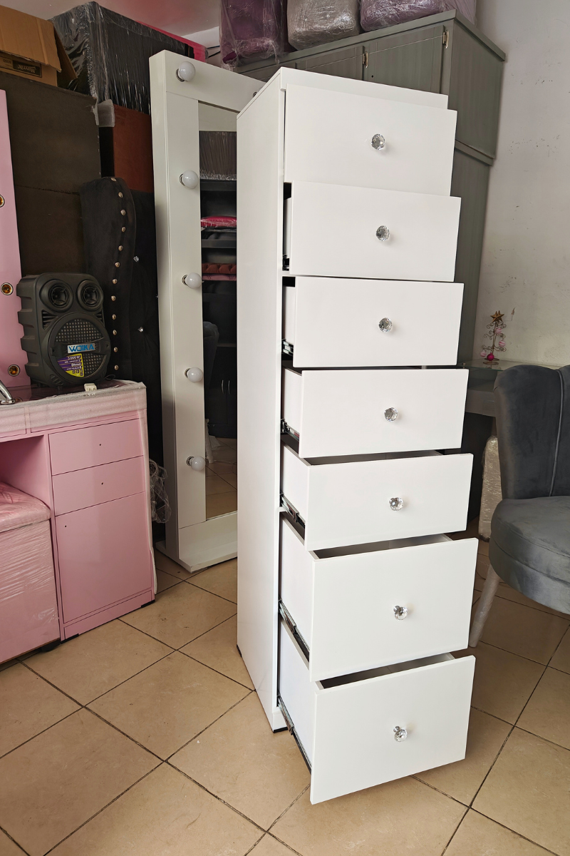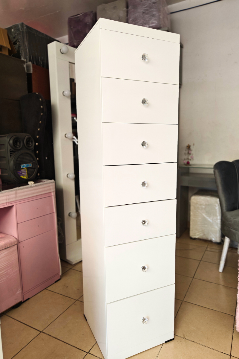 Almacenamiento Vertical Su principal ventaja es el diseño vertical, que optimiza tu habitación ofreciéndote 7 espaciosos cajones, uno sobre otro. Es la solución ideal para guardar maquillaje, accesorios, ropa interior o todo lo que necesites tener a la mano.