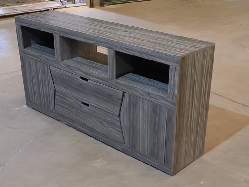Diseño Geométrico y Funcional El punto focal de este mueble son sus dos cajones centrales, que presentan un diseño geométrico angular en los frentes. Esta estética moderna se complementa con un sistema limpio sin tiradores (tipo uñero).