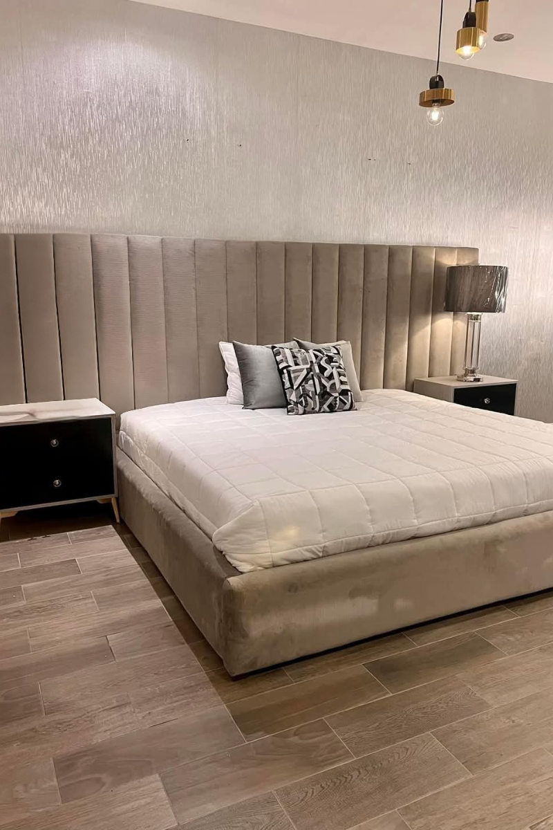 Cabecera Panorámica Acanalada La protagonista absoluta es su imponente cabecera extra ancha, diseñada para cubrir gran parte de la pared (estilo “wall panel”) y enmarcar no solo la cama, sino también los burós. Su superficie está tapizada con un elegante diseño acanalado vertical (channel tufting), que aporta altura, textura y un look muy moderno.