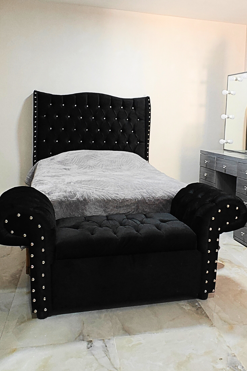 Viste tu habitación con un lujo dramático y sofisticado con la Cama “Princess”. Este diseño es pura elegancia, combinando un suntuoso tapizado en terciopelo negro con detalles brillantes que la convierten en la pieza central de cualquier recámara.