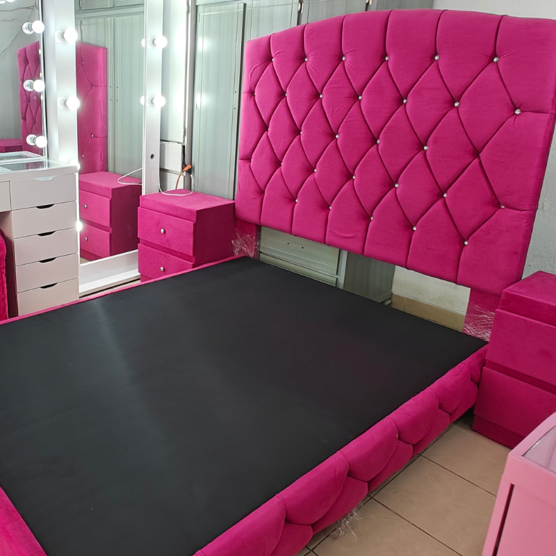 Viste tu habitación con un estilo glamuroso y vibrante con la Recámara “Sirena”. Este set de 4 piezas (Cabecera, Base y 2 Burós) está diseñado para crear una atmósfera de lujo y confort, todo tapizado en un espectacular terciopelo fucsia.