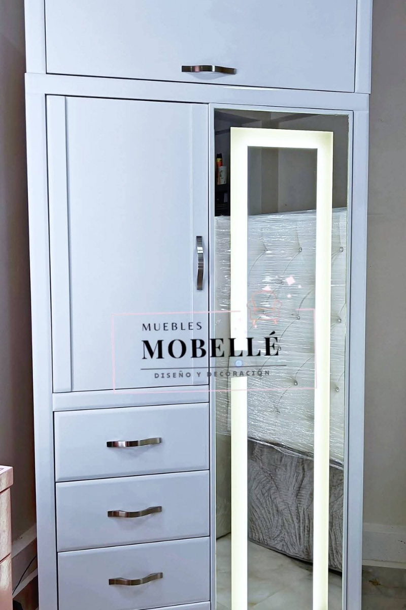 El Glamour se Ilumina: Espejo con LED Integrado La característica estrella de este ropero es su puerta de espejo de cuerpo completo con iluminación LED integrada. Las luces estratégicamente colocadas te ofrecen una visibilidad perfecta para arreglarte y probarte atuendos, añadiendo un toque de lujo y funcionalidad a tu espacio.