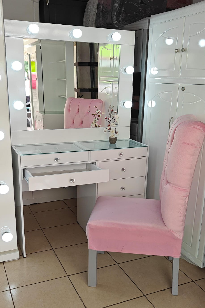 Descubre el Tocador “Vanity Princess Deluxe”, el balance perfecto entre glamour y funcionalidad. Ilumina tu rostro con 9 focos LED estilo Hollywood y organiza todo en sus 6 prácticos cajones con cubierta de cristal. ¡Disponible en varios colores! (Accesorios no incluidos).