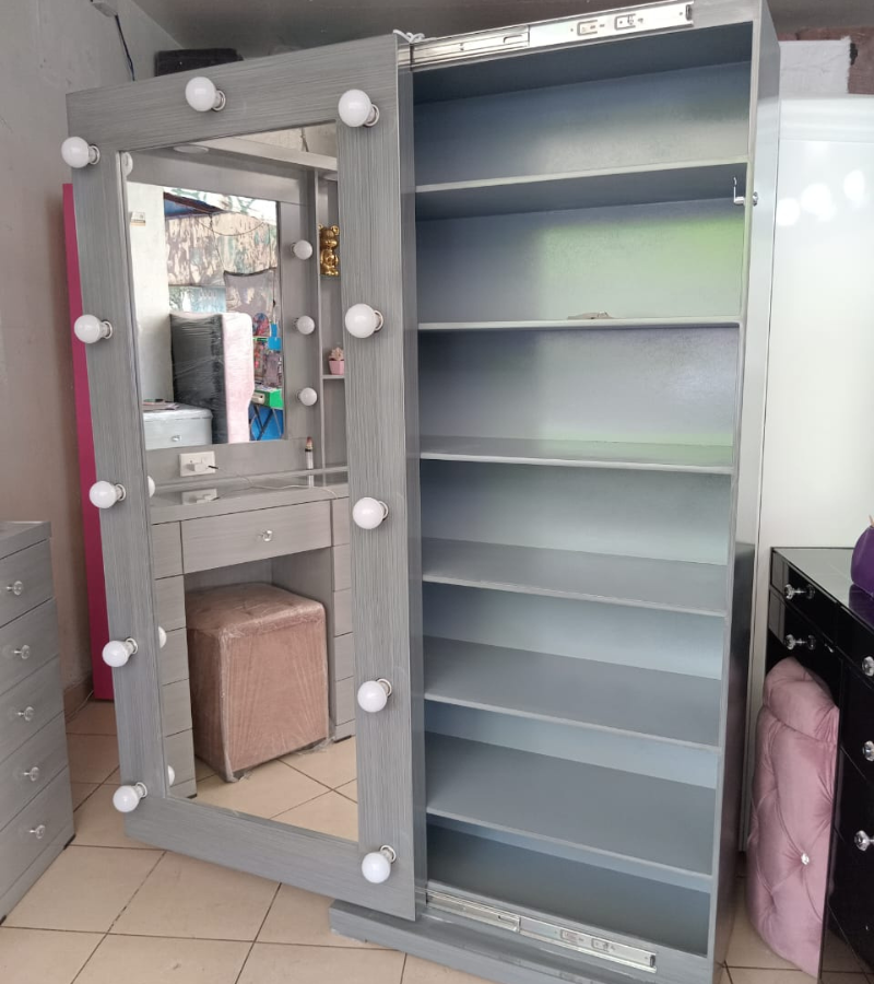 La estrella de este mueble es su única y gran puerta corrediza. Esta puerta es un espectacular espejo de cuerpo completo, enmarcado por 11 potentes focos LED estilo Hollywood, dándote la iluminación perfecta para tu look diario.